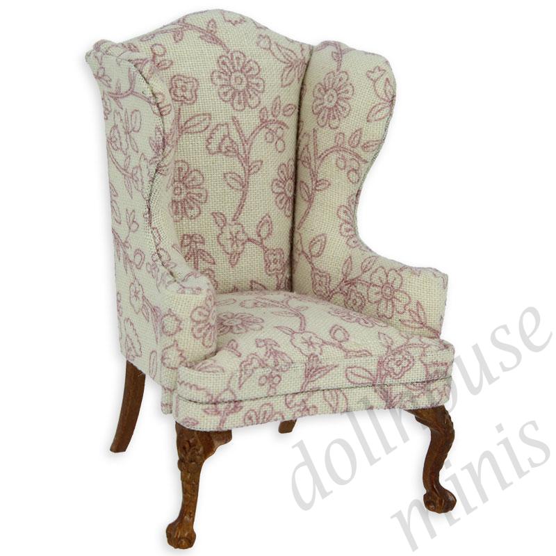 armchair waln. fabrick w/oldpink flowers miniature 1:12