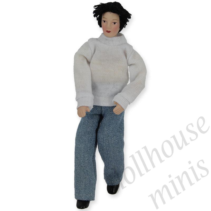 porcelain doll man jeans and white pullower miniature 1:12