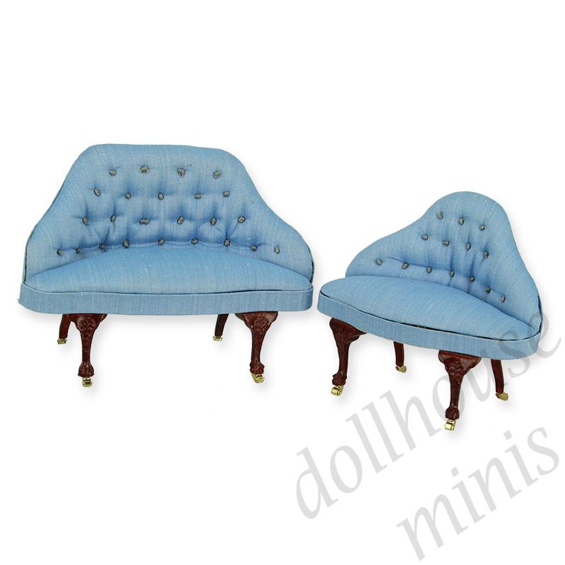 set 2 pcs sofa and armchair blue quilted walnut miniature 1:12