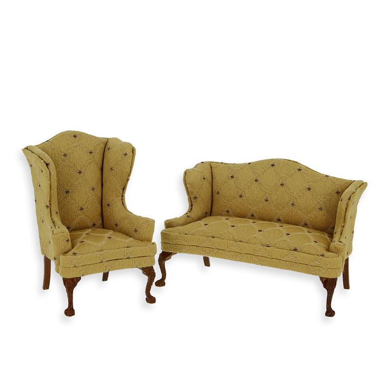 set of 2 pcs. armchair and sofa ochre walnut miniature 1:12