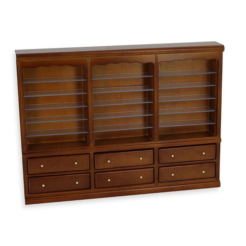 triple bookcase drawers walnut miniature 1:12